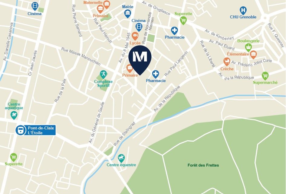 Située au sud de Grenoble, Échirolles séduit par son dynamisme et son environnement agréable. Ville en pleine évolution, elle bénéficie d’une situation stratégique, avec un accès rapide aux pôles économiques grenoblois, notamment le CHU, accessible en 5 min en voiture*, ainsi qu’à de nombreux espaces verts préservés. Son accessibilité est optimale grâce à la ligne A du tramway et aux lignes de bus situées à proximité de la résidence, permettant de rejoindre facilement le centre de Grenoble et ses facultés. La gare d’Échirolles, à seulement 9 min en transports en commun*, offre des liaisons rapides vers la gare TGV de Grenoble.