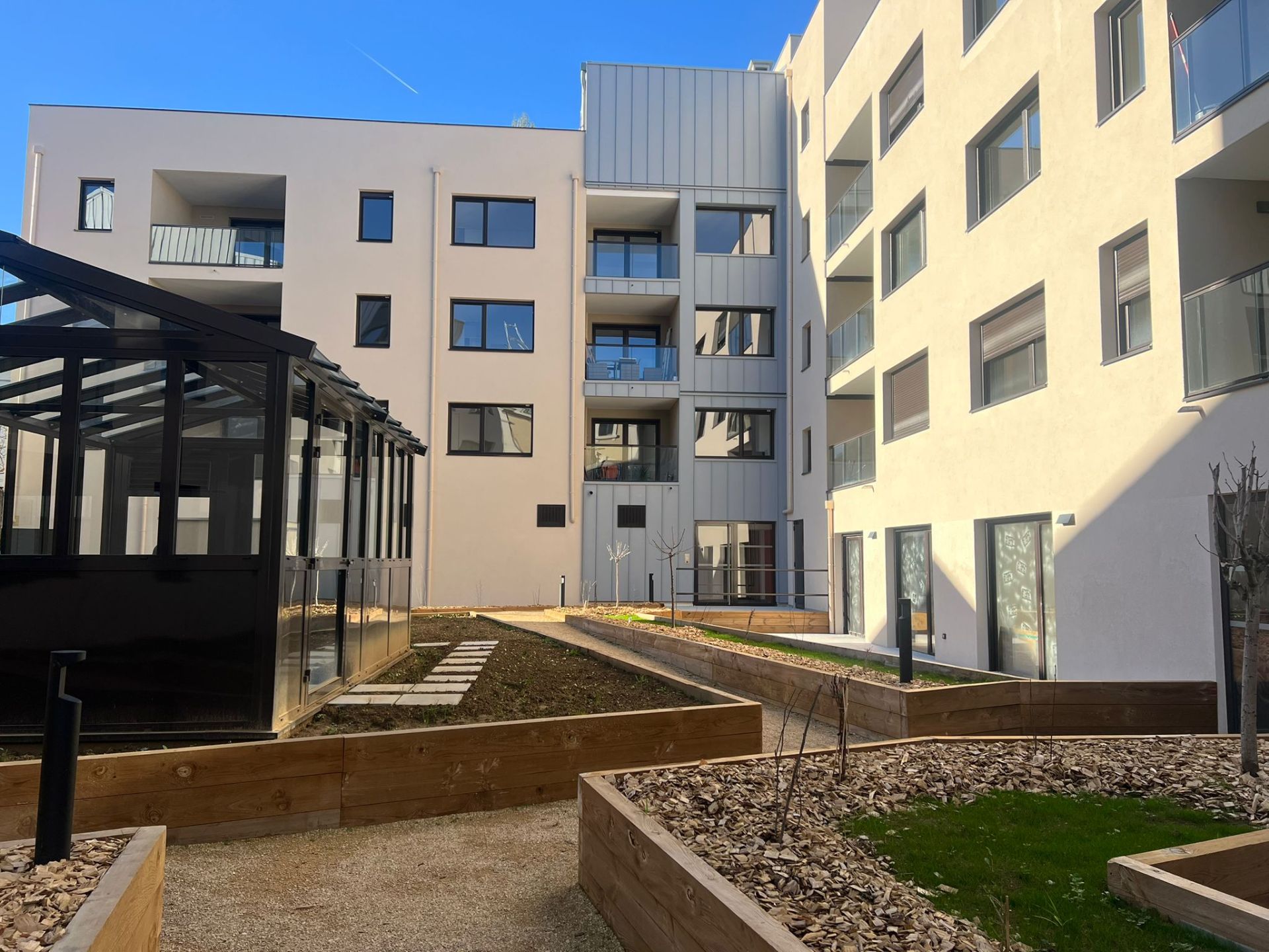 de vie. Profitant pour la plupart d'une double exposition, les intérieurs jouissent d'une belle luminosité à toute heure de la journée. Au coeur des logements, fermé par des verrières d'atelier en menuiserie sombre, un patio, isolé et chauffé, se module au gré de vos envies. Entre jardins privatifs, patios intérieurs et grandes terrasses en plein ciel en dernier étage, chaque logement bénéficie d'une « pièce de vie » supplémentaire ouverte sur l'extérieur.