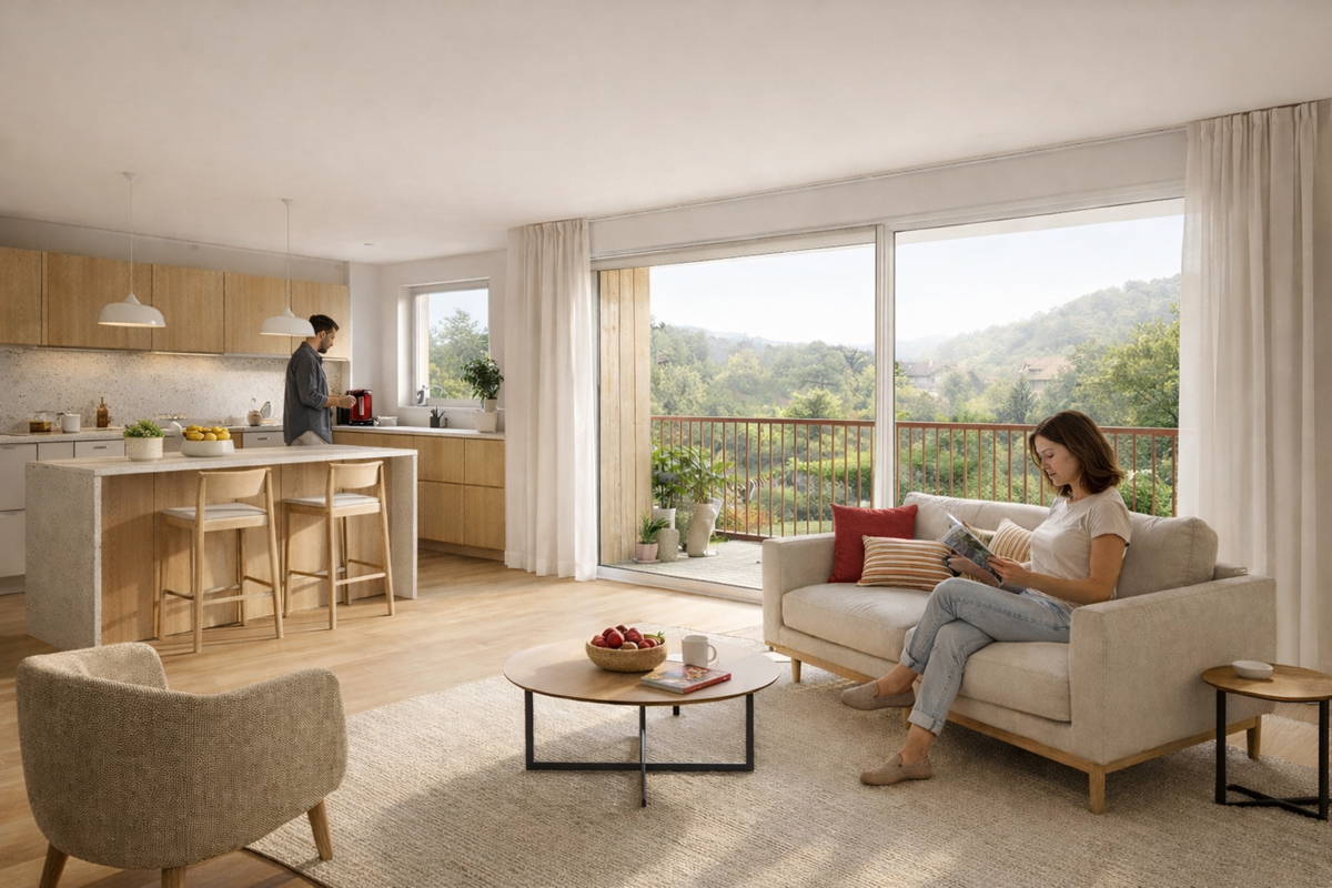 La résidence se compose de 27 appartements seulement, du 2 au 4 pièces, dont 4 logements en Bail Réel Solidaire, tous prolongés par balcon, terrasse ou jardin privatif. Une typologie cohérente avec la demande locale, les résidences secondaires et les acquisitions patrimoniales long terme.