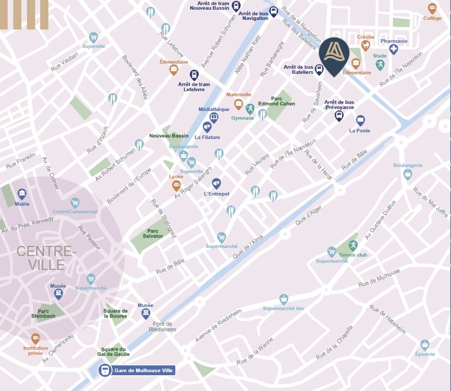 Située à seulement 3 kilomètres du centre-ville et à quelques minutes de la gare de Mulhouse, la résidence associe le charme des bords de canal avec la proximité des infrastructures citadines. Vous y trouverez tous ce dont vous aurez besoin pour vous offrir une vie quotidienne active et agréable. Vous pourrez vous balader dans les ruelles animées du centre-ville ou le long de l’eau qui conduit directement au Nouveau-Bassin, quartier prisé pour les loisirs.