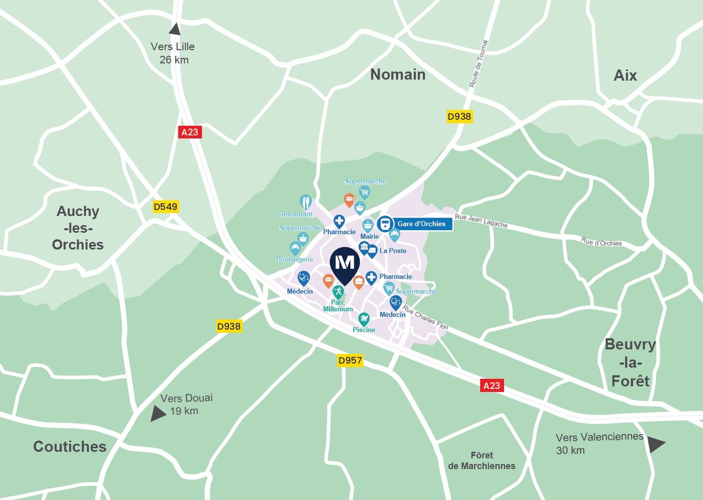 Entre ville et campagne, notre résidence se situe dans la petite commune recherchée d'Orchies au cœur d'un territoire champêtre typique. Véritable havre de paix, la résidence comprend 28 appartements, du 2 au 4 pièces, tous ouverts sur un espace extérieur : jardin privatif en rez-de-chaussée, balcon ou terrasse au dernier étage.