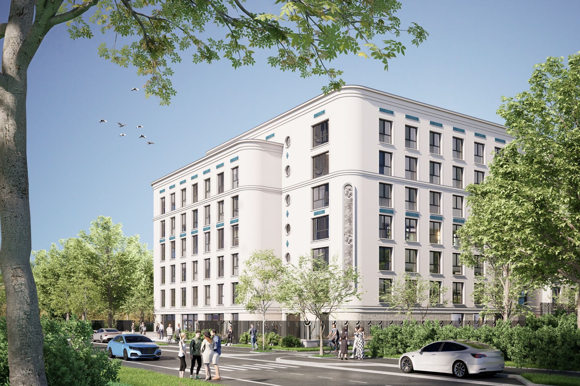 Composée de 200 appartements meublés, la résidence adopte un vocabulaire architectural inspiré de l’Art Déco, rappelant l’âge d’or du cinéma. Les façades se distinguent par leurs courbes élégantes, leurs céramiques turquoise sur fond pierre et leurs corniches finement travaillées, qui composent une écriture architecturale raffinée.