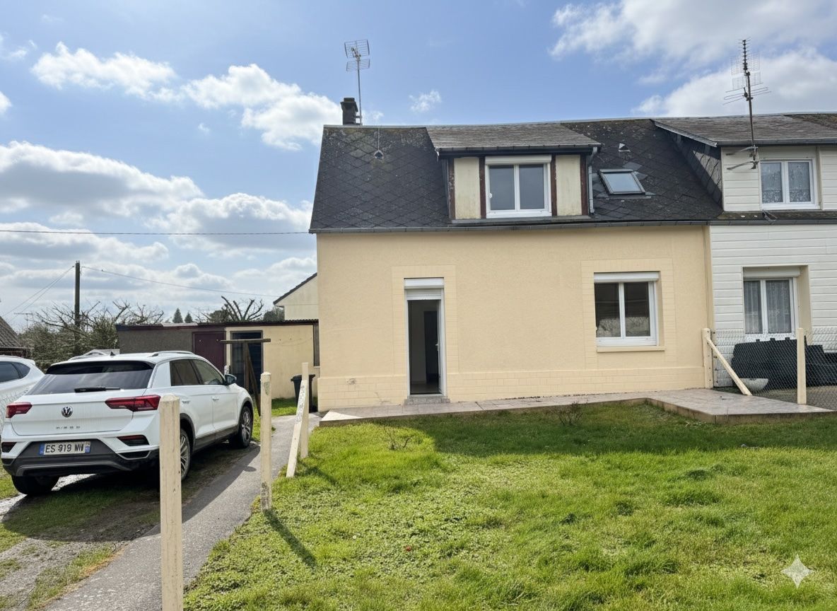Le bien : Maison mitoyenne d’un côté avec cuisine, séjour-salon, WC. À l’étage : palier, 2 chambres, dégagement, salle de bains. Cellier. Terrain de 200 m².