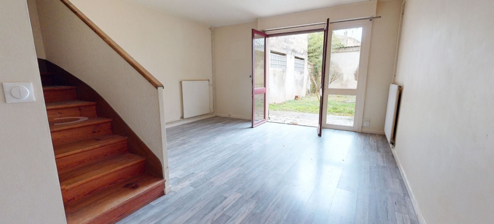 Le bien : Appartement T3 en duplex avec salon, cuisine séparée, WC au RDC, grand jardin. À l'étage, deux chambres et une salle de bain.