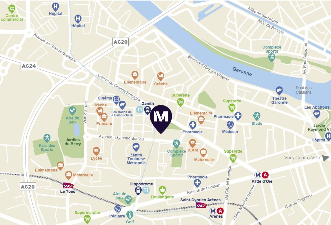 À quelques minutes à pied, les Jardins du Barry et les bords de Garonne offrent un cadre naturel privilégié. Le Zénith, l'aéroport, l'hôpital Purpan et le centre-ville sont rapidement accessibles, grâce à l'arrêt de tramway T1 _ Zénith _ situé au pied de la résidence, et aux lignes de bus 31 et 45.