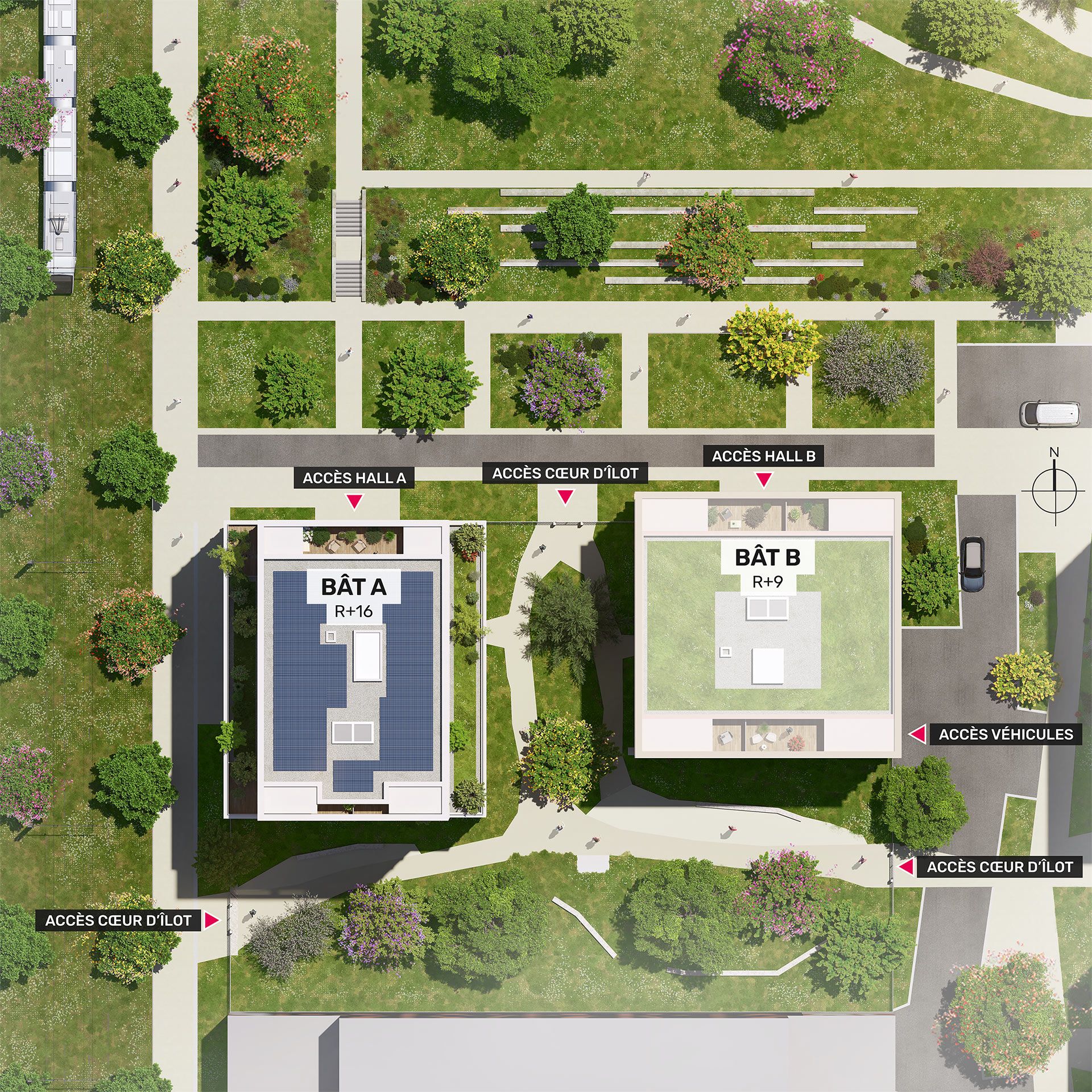La résidence s'organise autour d'un cœur d'îlot paysager pensé comme un lieu de respiration et de rencontre. Une promenade douce traverse l'ensemble, ponctuée de zones de détente. Des locaux vélos facilement accessibles, un parking et des accès sécurisés viennent compléter les services offerts par ce cadre de vie moderne et convivial.