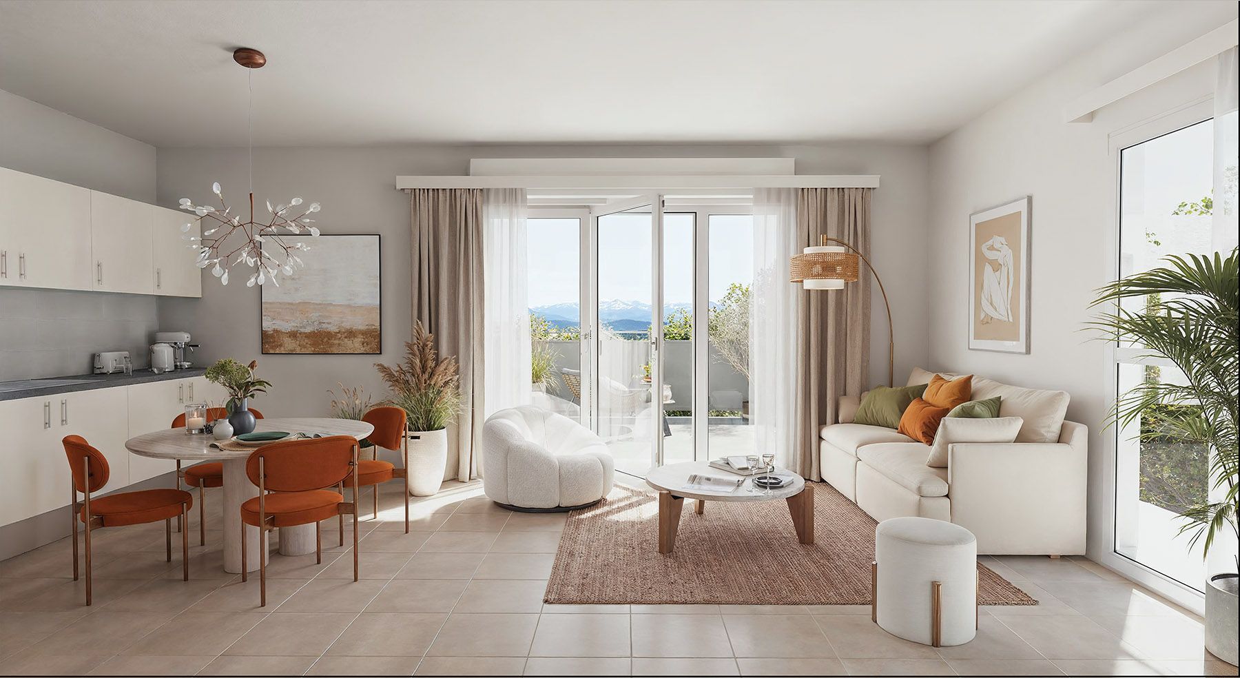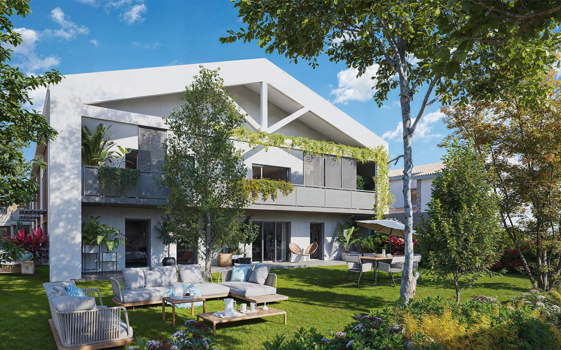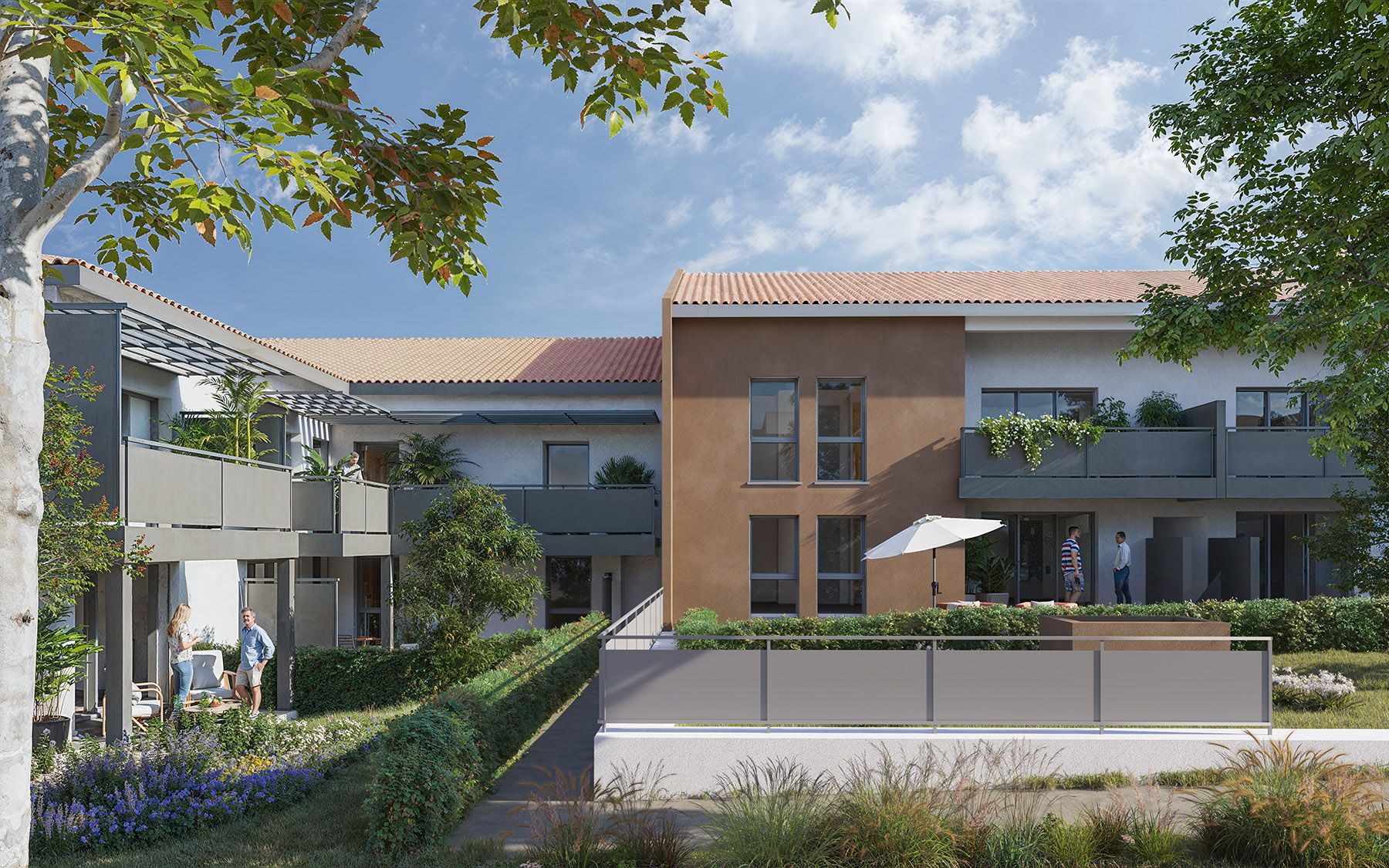 Otakam propose 46 logements - 42 appartements et 4 villas jumelées - du T1 bis au T5, conçus dans un esprit résolument résidentiel. L'écriture architecturale sobre et soignée se distingue par ses toitures en tuiles traditionnelles rouge, ses façades en enduit blanc du Littoral et teinte brun moyen, ses briquettes de parement, ses menuiseries PVC et sa serrurerie gris anthracite. La résidence est conforme à la norme RE2020 et dispose de 67 places de stationnement en sous-sol, avec 2 places par logement pour la majorité des typologies.