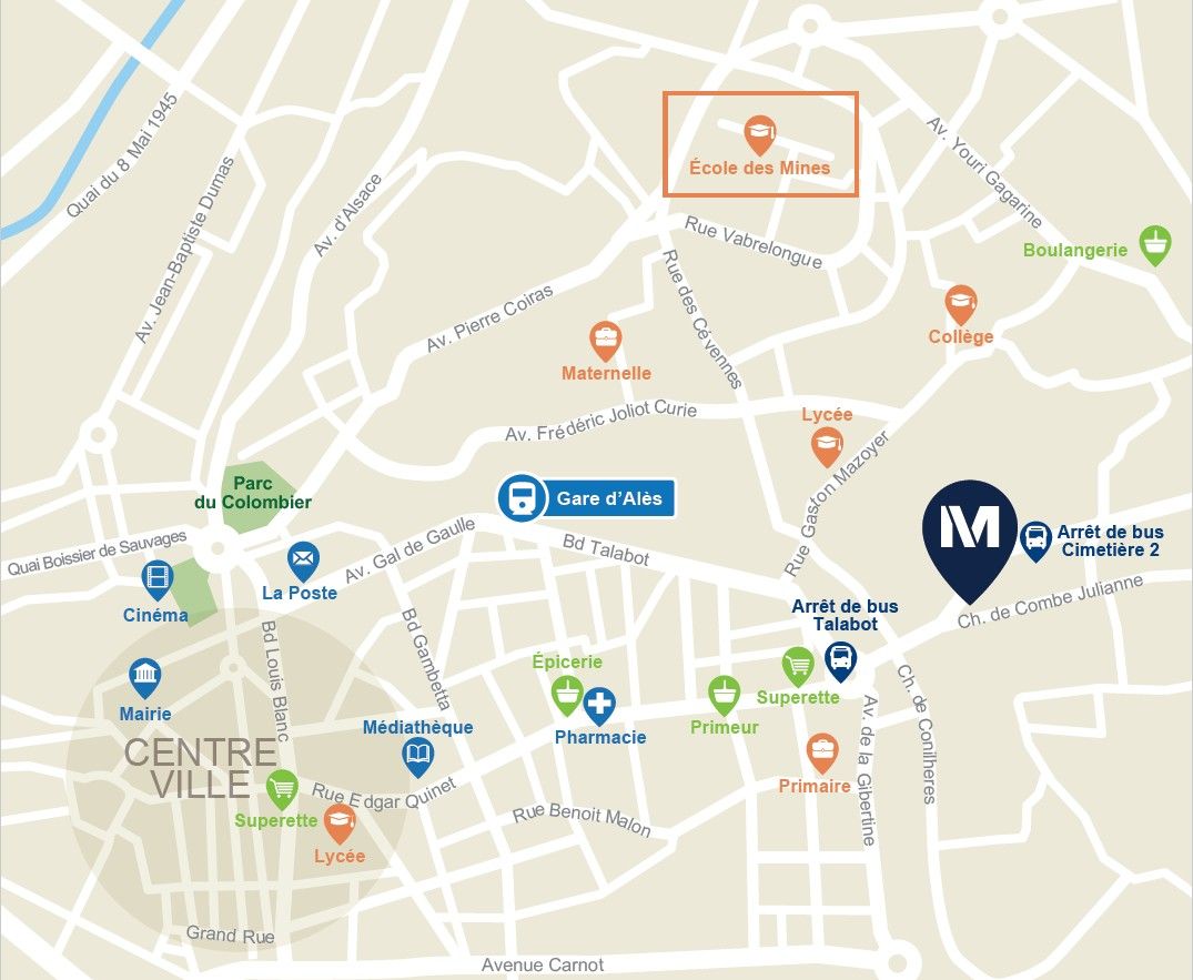 Idéalement située à quelques minutes à pied de l'École des Mines d'Alès, Urbaneo – Les Mines offre un cadre de vie adapté aux besoins des étudiants et des jeunes actifs, alliant confort, sécurité et convivialité. Notre nouvelle résidence est à proximité immédiate d’une supérette et d’un primeur accessibles directement à pied, ainsi que de la gare d'Alès, située à seulement 5 min* à vélo, permettant des déplacements rapides et pratiques. Les transports en commun desservent efficacement les différents quartiers de la ville avec notamment de nombreux arrêts de bus dans les alentours, garantissant un accès facile aux établissements scolaires et universitaires ainsi qu'aux espaces de loisirs.