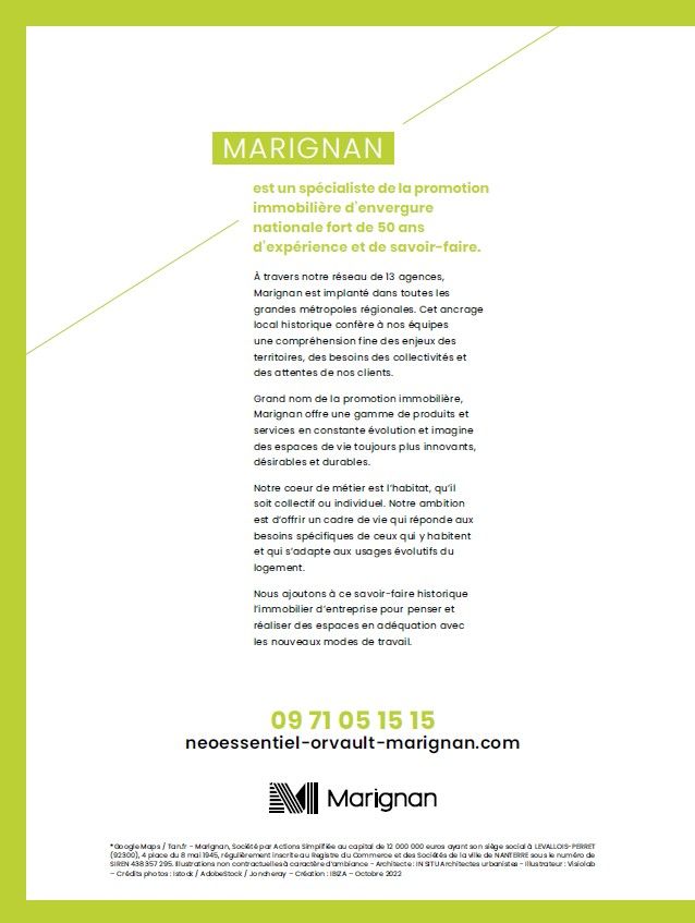 Le long de la route de Vannes, au coeur d'un ensemble de plusieurs bâtiments d'une grande variété architecturale, se trouve le futur poumon vert du quartier Néo à Orvault, où la nature s'illustre pleinement créant ainsi des zones de détente, de rencontre ou de jeux. Répondant parfaitement aux aspirations actuelles, les circulations douces ont pris le pas sur la voiture au travers de cheminements piétonniers et de pistes cyclables.Un large choix d'appartements, du 2 au 4 pièces s'offre à vous, tous prolongés par un balcon, un jardin privatif ou une magnifique terrasse aux vues exceptionnelles. Leurs surfaces intérieures profitent d'un maximum d'ensoleillement grâce à leurs orientations optimisées.