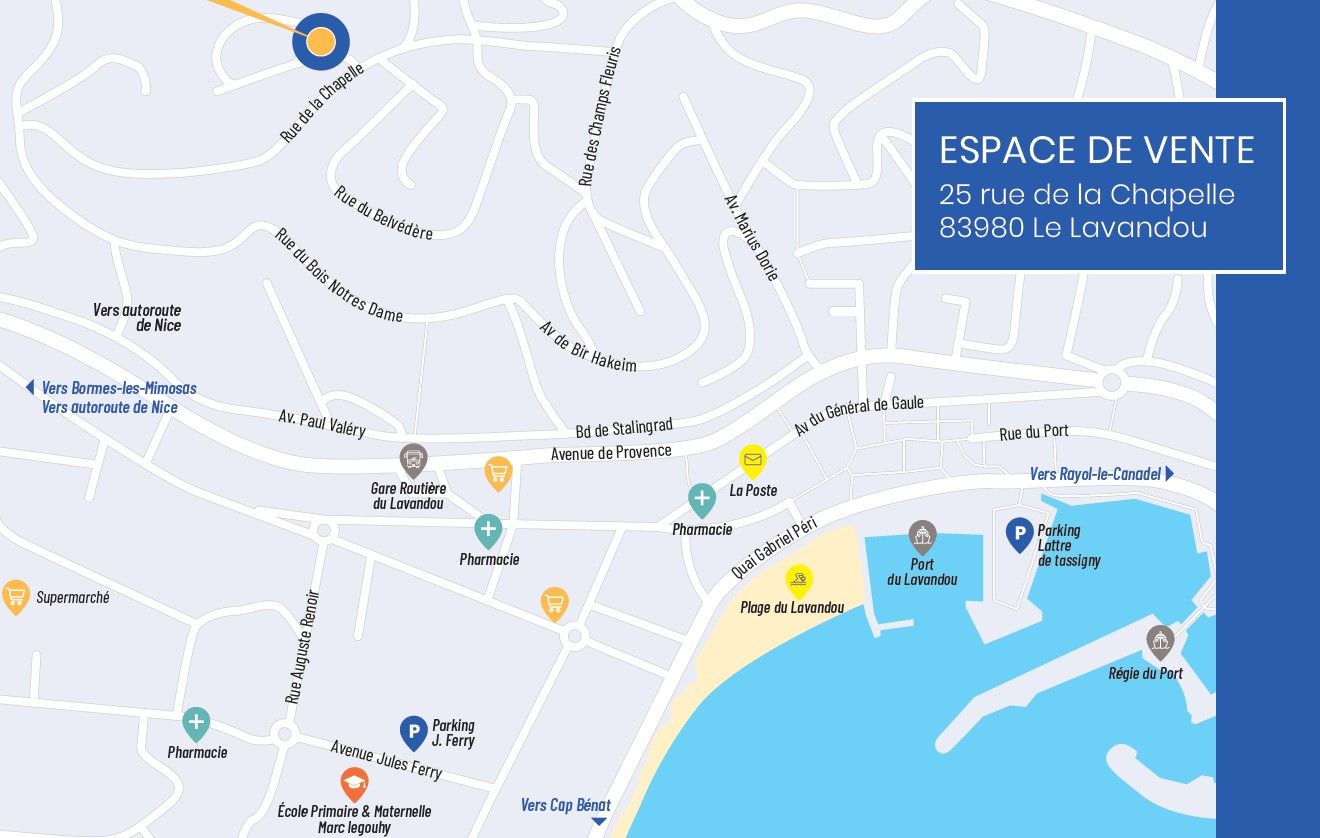 Vivre au Lavandou, c’est profiter d’un environnement naturel exceptionnel. À seulement 22 km de Hyères et 40 km de Toulon, la résidence est idéalement située à proximité des plages, des ports de plaisance, des commerces et des marchés provençaux.